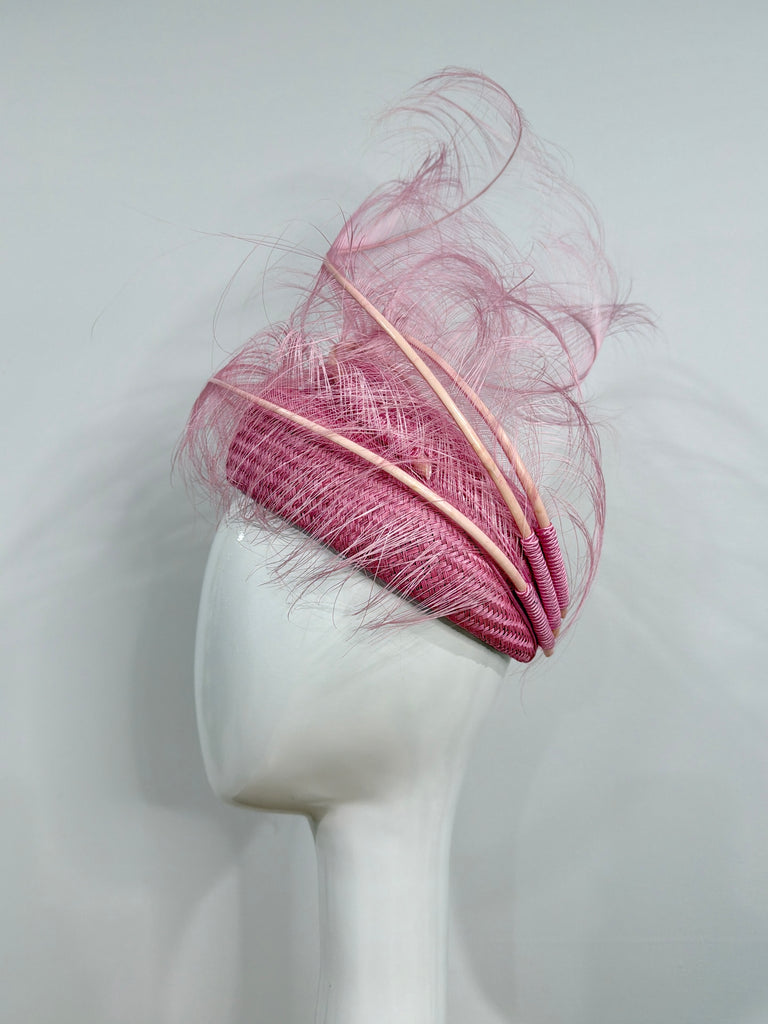 Pillbox in Pink - This stunning pillbox is made on a block exclusively carved by me! Blocked in a textured straw with braid details and a spray of ostrich feathers - this is a stand out piece.
