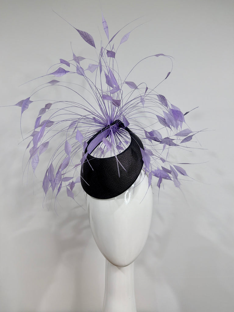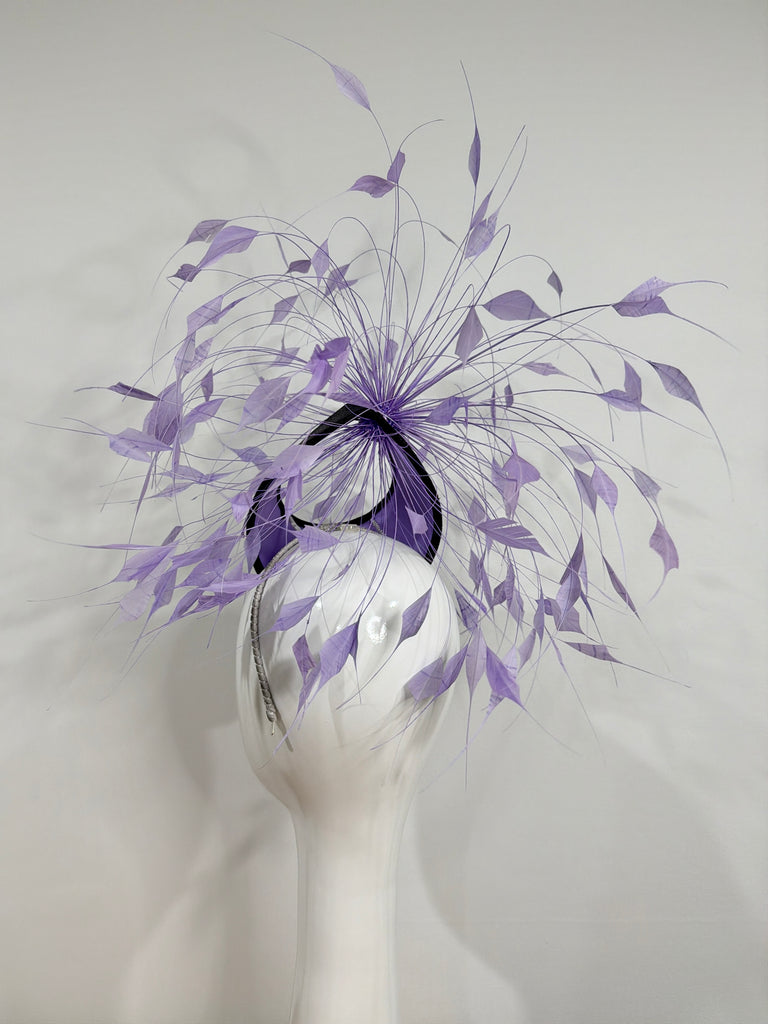 Teardrops of Mauve - Designed for maximum impact, the extra long mauve feathers have all been hand cut into a sleek point and burst out from a navy blue open teardrop base lined with mauve leather. Ultra light and on a velvet wrapped headband with comb.